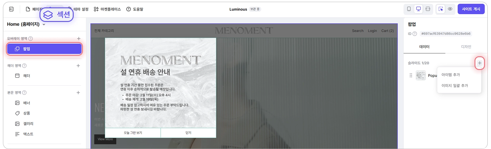 디자인 에디터의 [섹션 > 오버레이 영역]에서 팝업 섹션 선택 후, 오른쪽 패널에서 팝업 이미지를 업로드합니다.