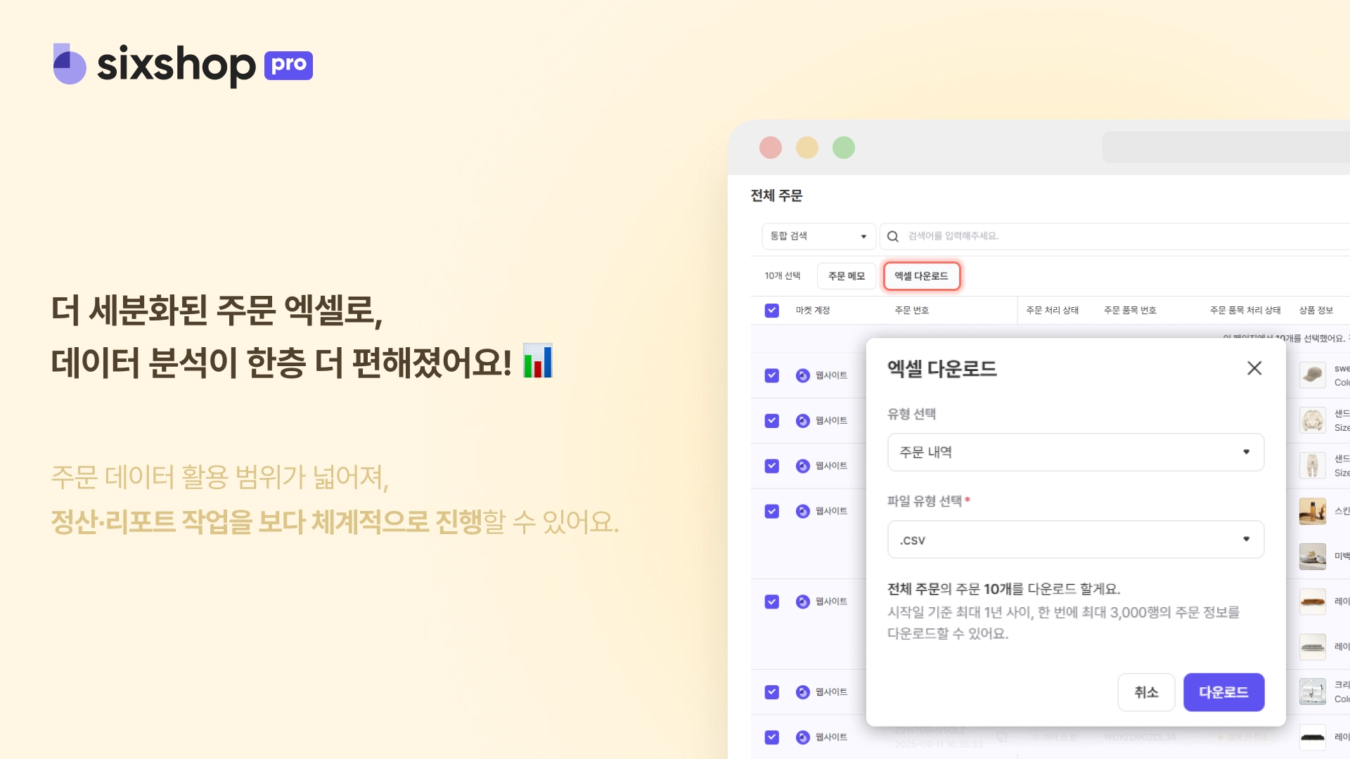 주문 엑셀 다운로드 시 단일 금액, 할인, 결제, 배송 정보 및 회원 등급 등 세부 데이터를 제공해요.