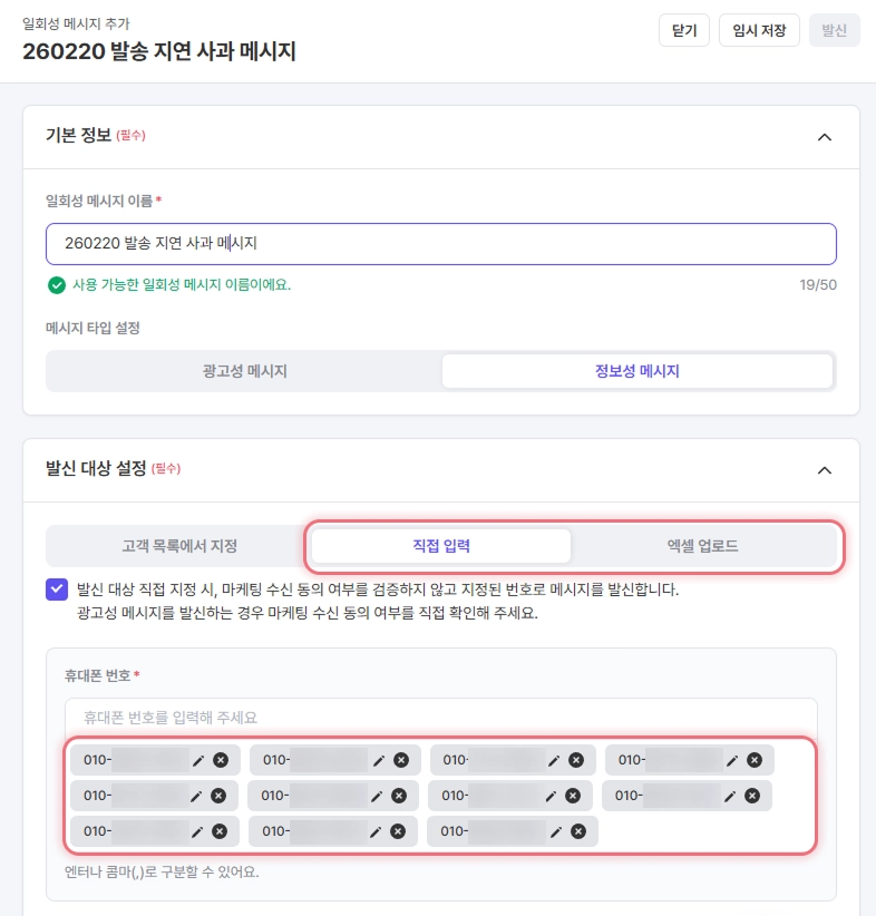 발신 대상 규모나 메시지의 커스텀 정도를 고려하여 직접 입력과 엑셀 업로드 방식을 선택할 수 있어요.