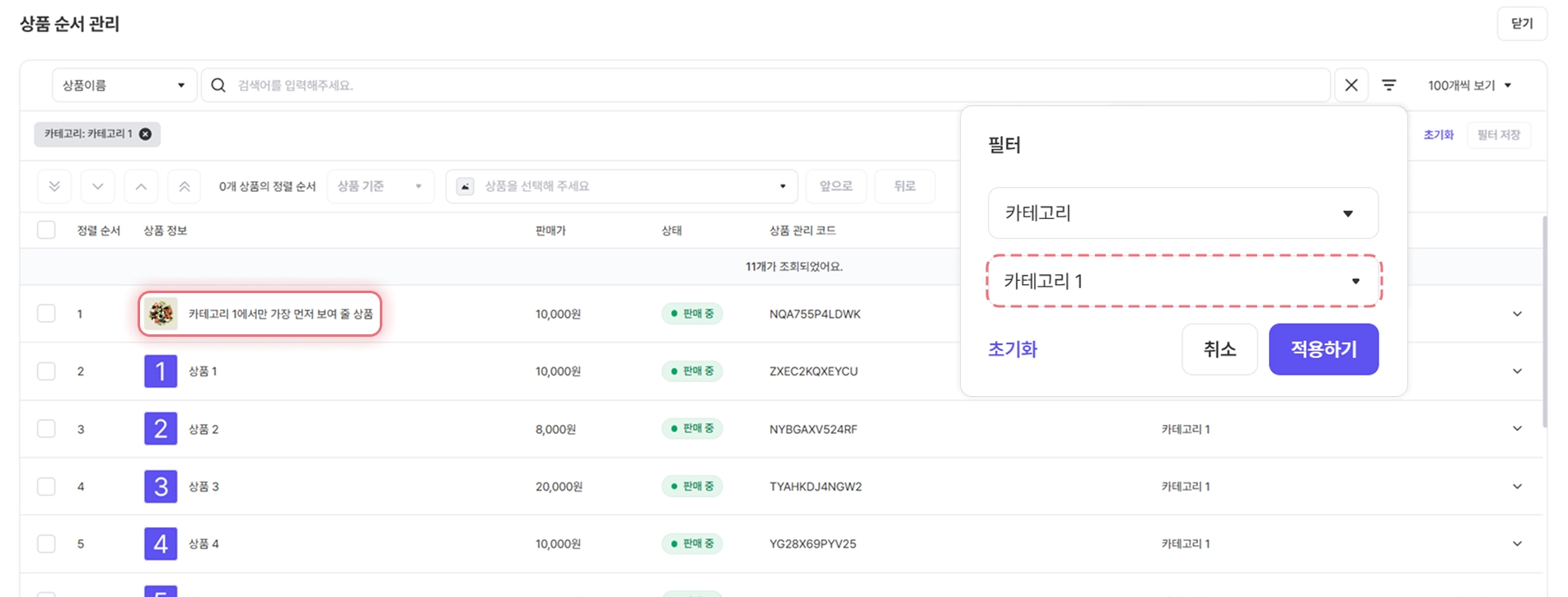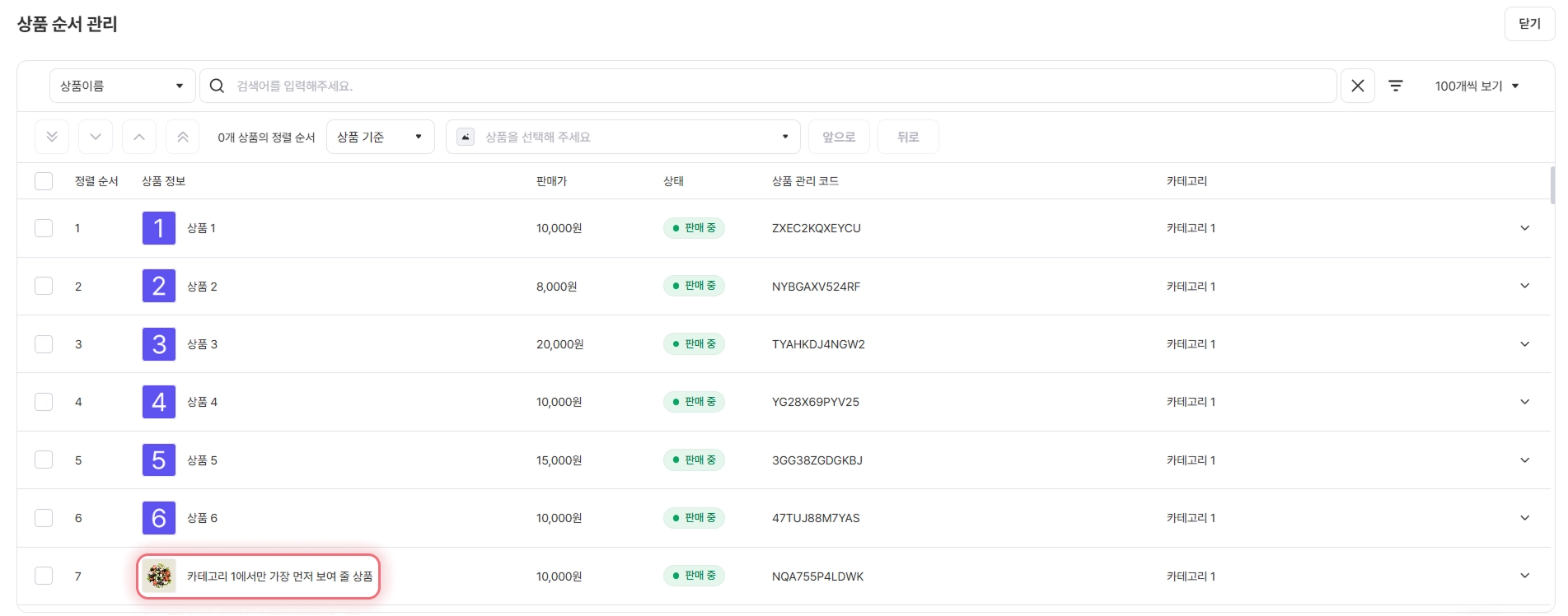 ‘A 상품 앞으로’, ‘B 상품 뒤로’와 같이, 특정 상품 기준으로의 순서 변경이 가능해요.
