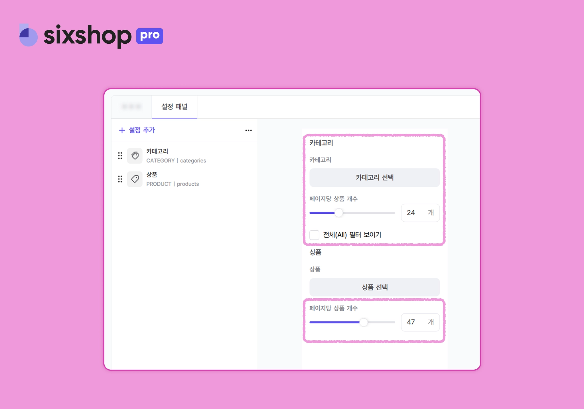 이제 블록을 제작할 때 설정 패널에 페이지당 상품 개수 설정 항목을 넣을 수 있어요.