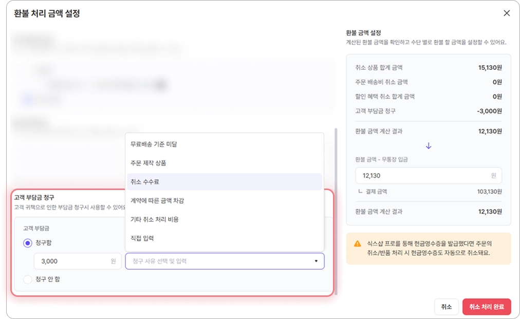 주문 취소 시에도 고객 부담금 설정 지원
