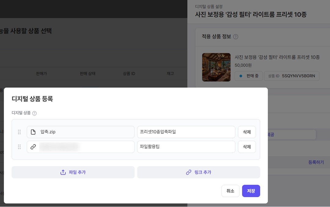 뿐만 아니라, 다운로드 기간/최대 횟수까지! 판매 상품 특성에 따라 활용도가 매우 높아요.