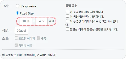 임베드 오른쪽 + 옵션 표시 를 클릭하고, 영상 아레 세부 옵션을 선택해 주세요.