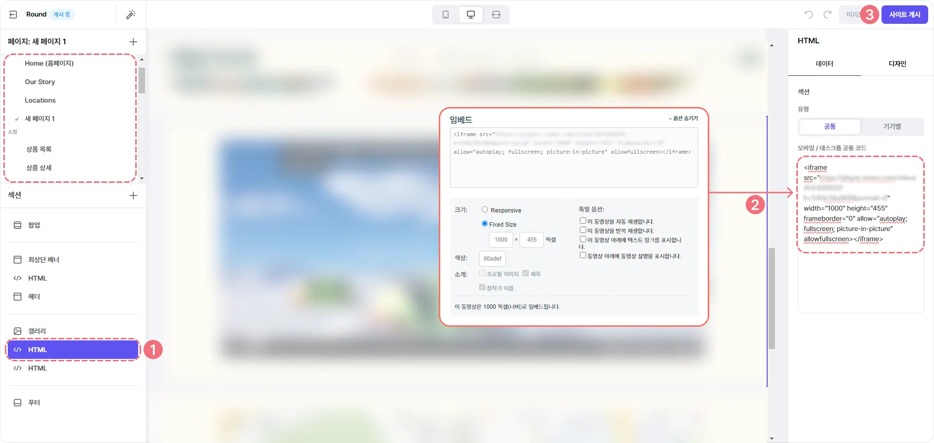 ②  왼쪽 패널 섹션 글자 오른쪽 + 클릭하고 HTML 섹션을 추가해 주세요.