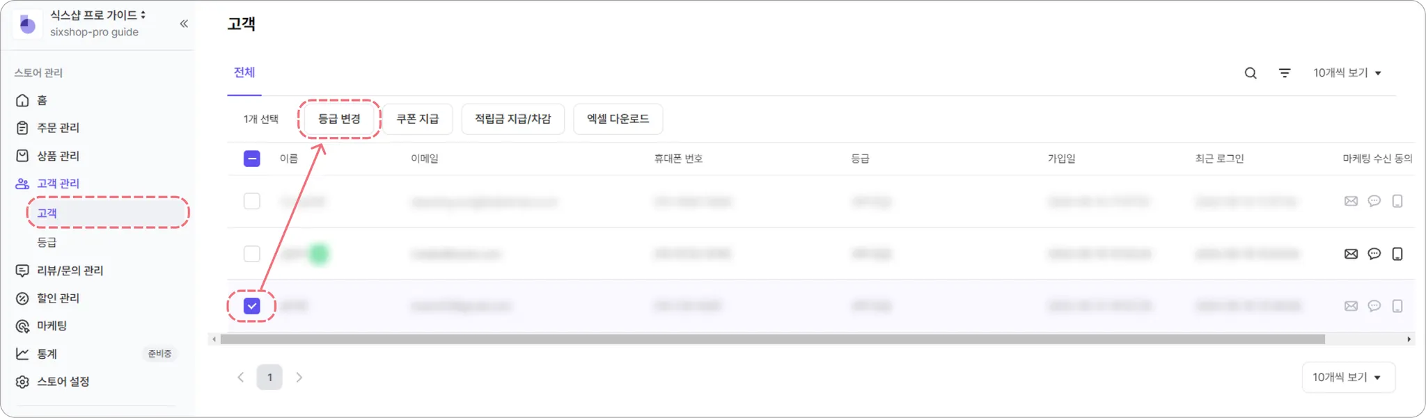 [식스샵 프로 > 고객 관리 > 고객]에서 대상 고객을 ✓(체크박스) 선택 후, 상단의 등급 변경 버튼을 클릭하여 등급을 조정할 수 있습니다.
