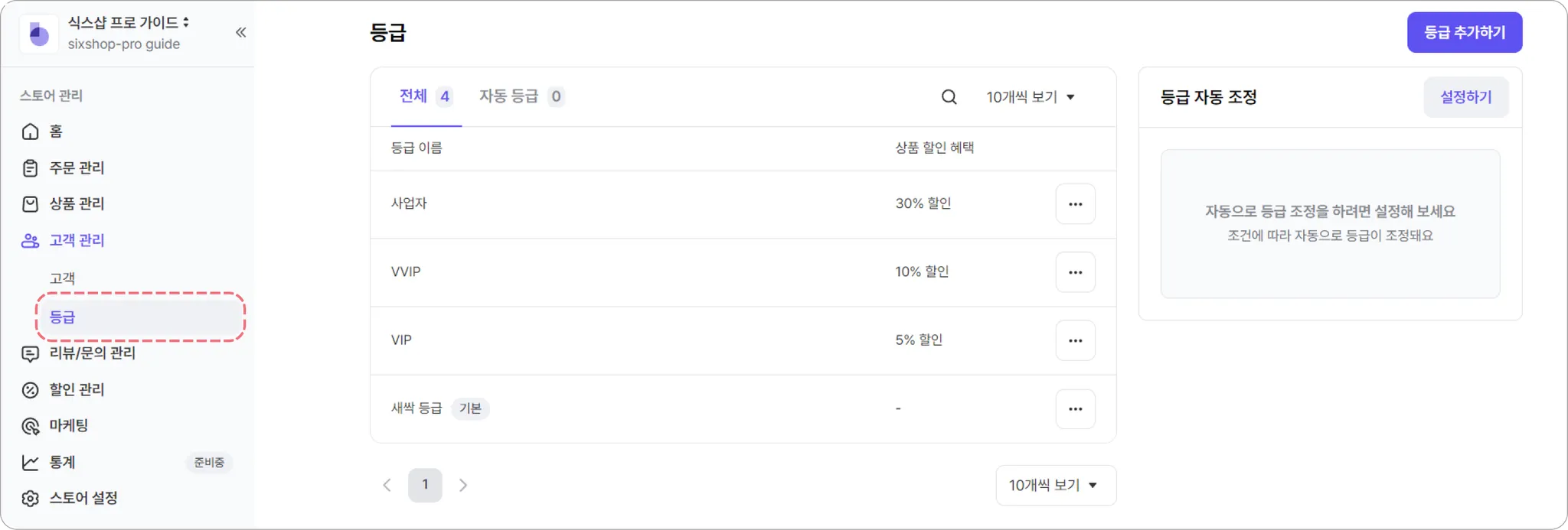 [식스샵 프로 > 고객 관리 > 등급]의 우측 상단 등급 추가하기로 등급을 추가할 수 있습니다.