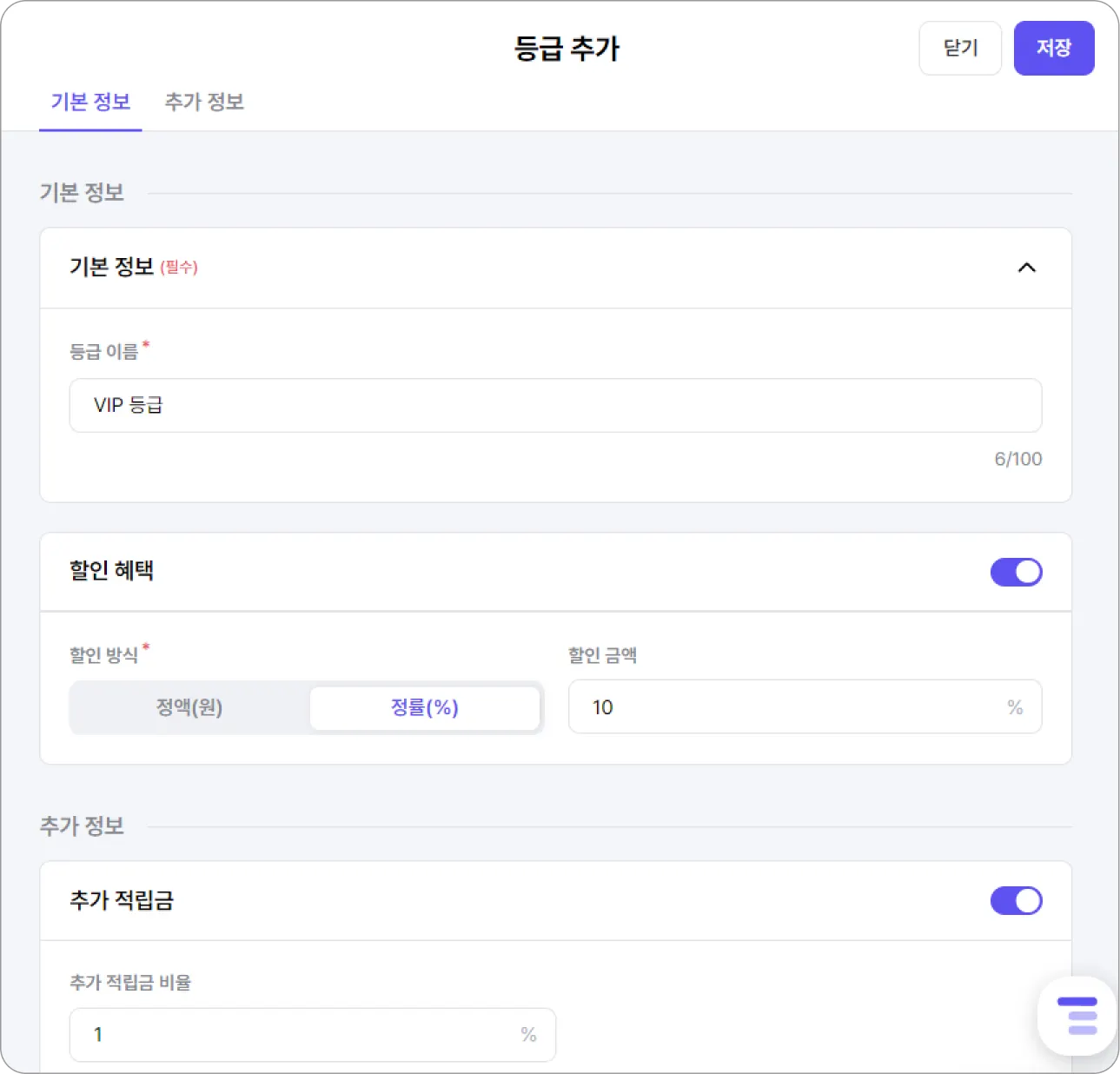 추가 적립금 기능을 이용하면 해당 등급의 고객은 설정된 비율에 따라 추가 적립을 받습니다.