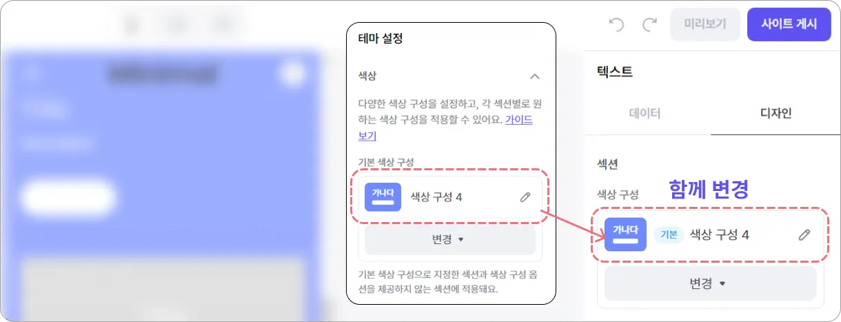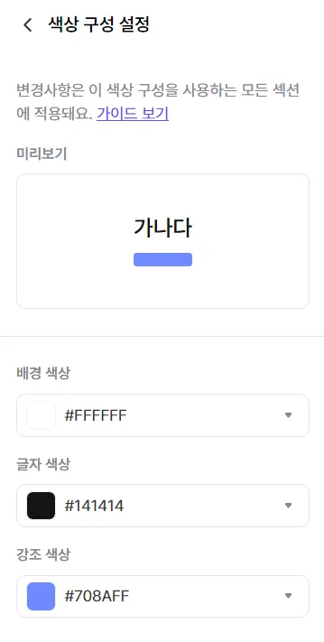 기본 색상 구성을 이용 중인 섹션이라면, 이후 테마 설정에서 기본 색상 구성을 변경했을 때 새로운 색상 값이 자동 적용됩니다.