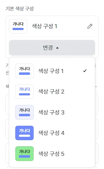 색상 구성은 상점에 적용되는 주요 색상(배경, 글자, 강조 색상 등)을 미리 조합해 두고