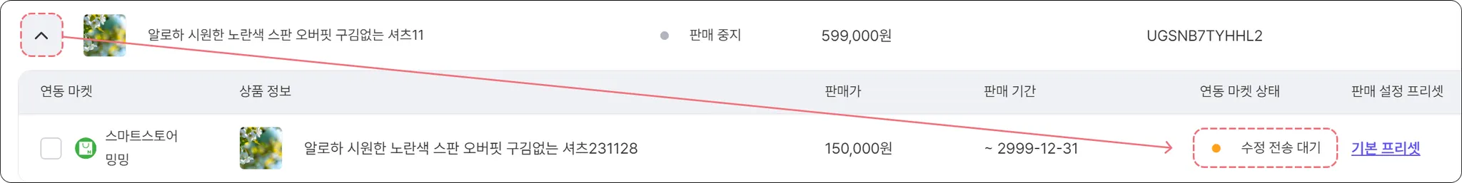 ③ 상단의 저장 버튼 클릭하고, 저장하기 후 연동 마켓 상태가 수정 전송 대기 상태로 변경됩니다.