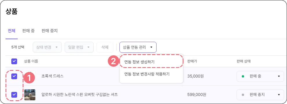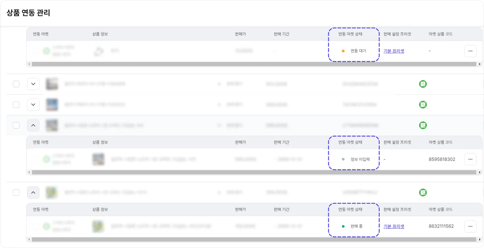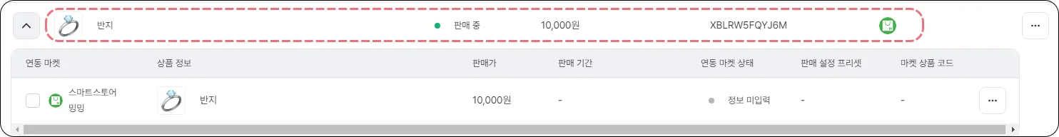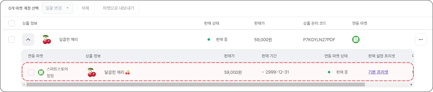 판매 중 | 연동 가능 | 상품 내보내기가 정상적으로 완료되어 마켓에서 판매 중인 상태입니다. |