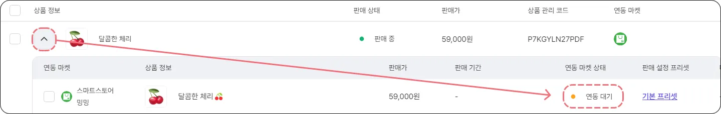 승인 대기 | 연동 가능 | 마켓에 상품 전송 후, 마켓에서 판매를 승인해야만 판매할 수 있습니다. |