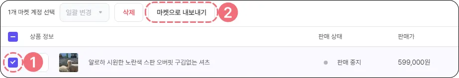 ④ 상품 앞 박스에 체크하고 마켓으로 내보내기 클릭하면 연동 마켓에 상품이 노출됩니다.