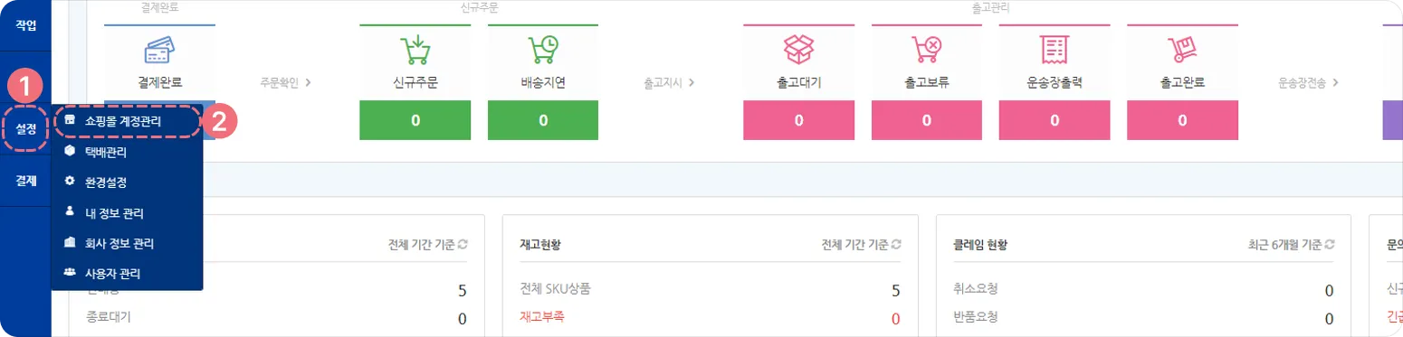 ① 플레이오토 2.0 솔루션 접속 > 설정 > 쇼핑몰 계정 관리로 이동