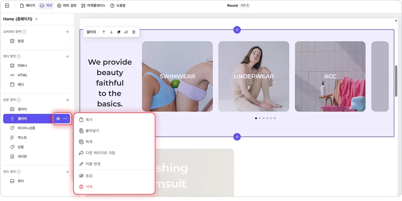 섹션을 복사/붙여넣기/복제/삭제하거나 다른 페이지로 이동시킬 수 있습니다.
