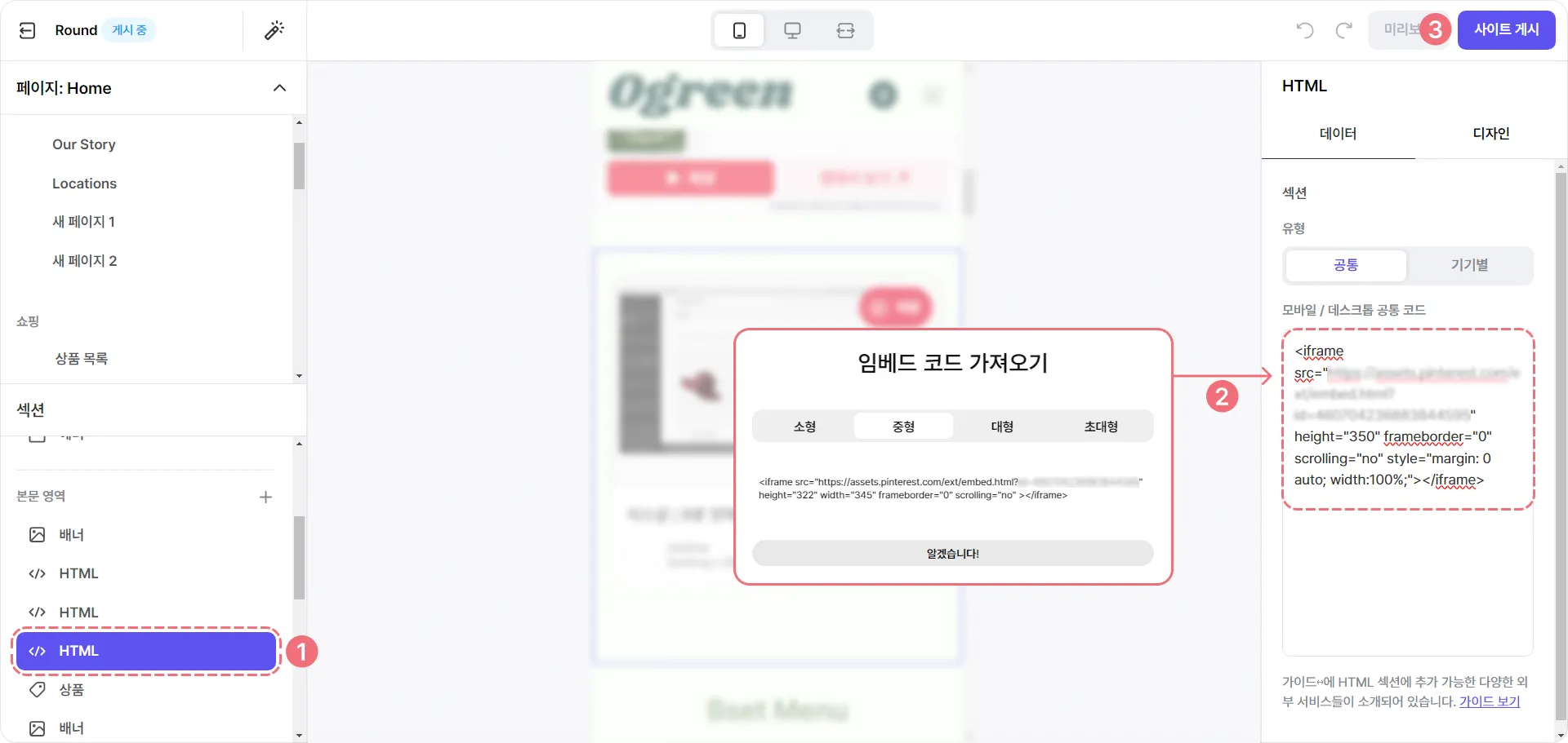 복사한 핀 임베드 코드의 URL을 아래 코드의 "핀임베드URL"에 붙여 넣기 한 후 HTML 섹션에 입력해 보세요. height="값"을 조정하면 높이를 변경할 수 있습니다.