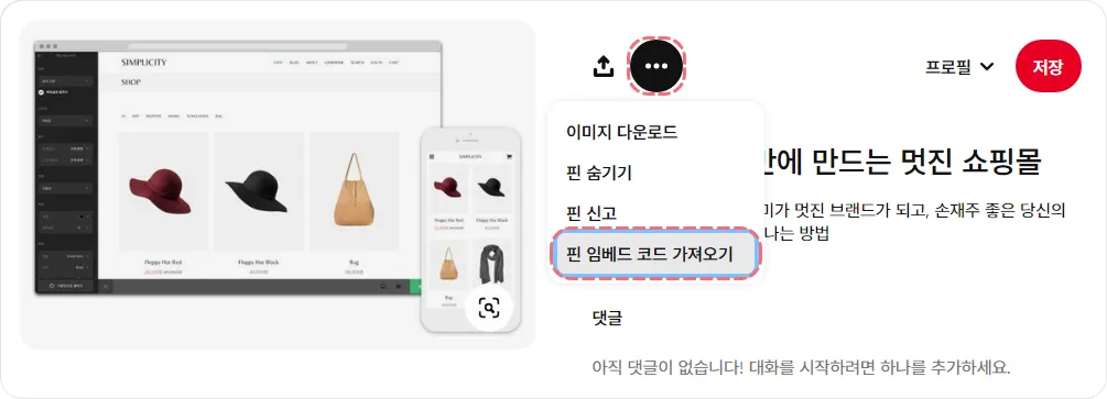 가져올 핀의 ··· 버튼을 클릭하고 핀 임베드 코드 가져오기를 클릭해 주세요.