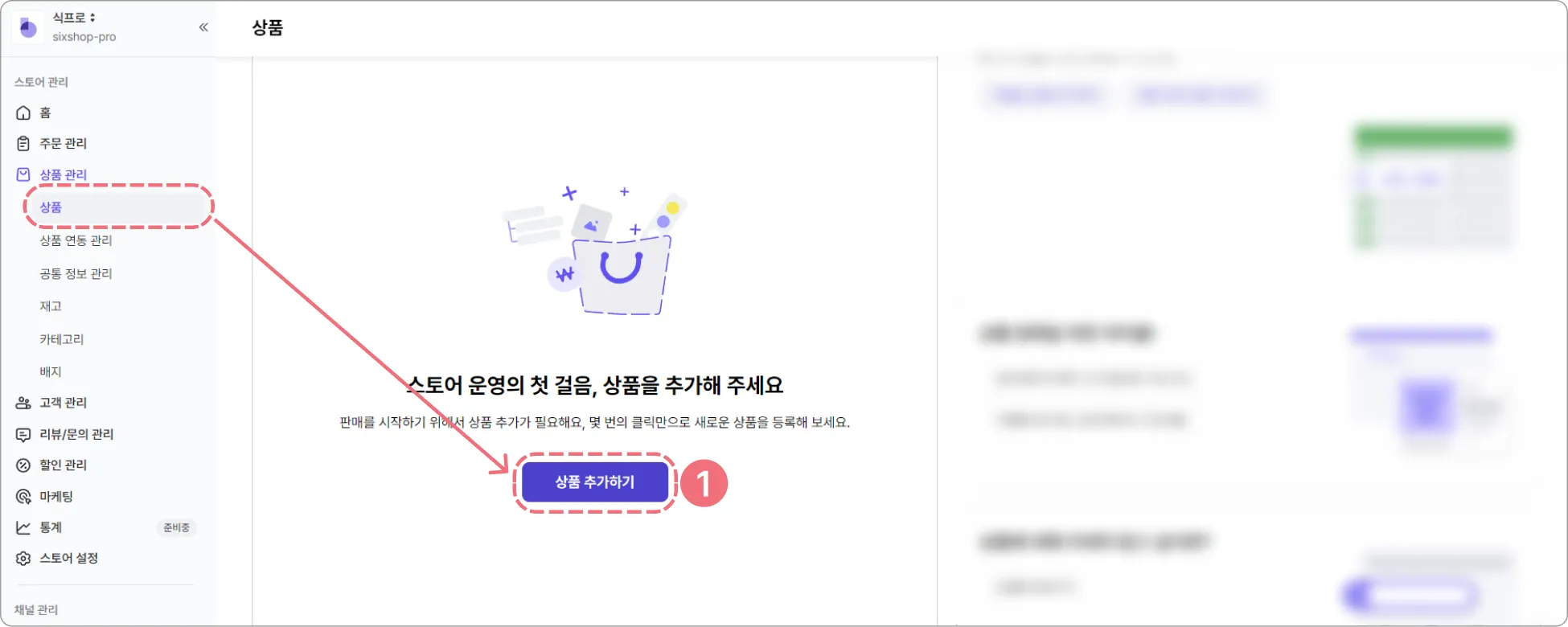 ① 먼저, 판매하려는 상품을 [식스샵 프로 > 스토어 관리 > 상품]에 등록해 주세요. 상품 추가하기 가이드를 활용하면 더욱 좋아요!