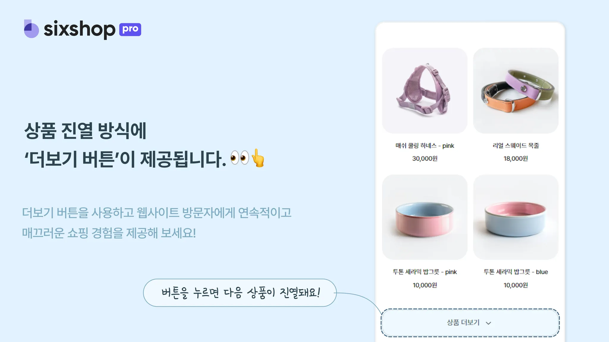 더보기 버튼을 사용하면 웹사이트 방문자가 상품을 스크롤 하면서 자연스럽게 상품을 살펴볼 수 있도록 도와줘요. 특히 모바일에서 장점이 부각되는데요!