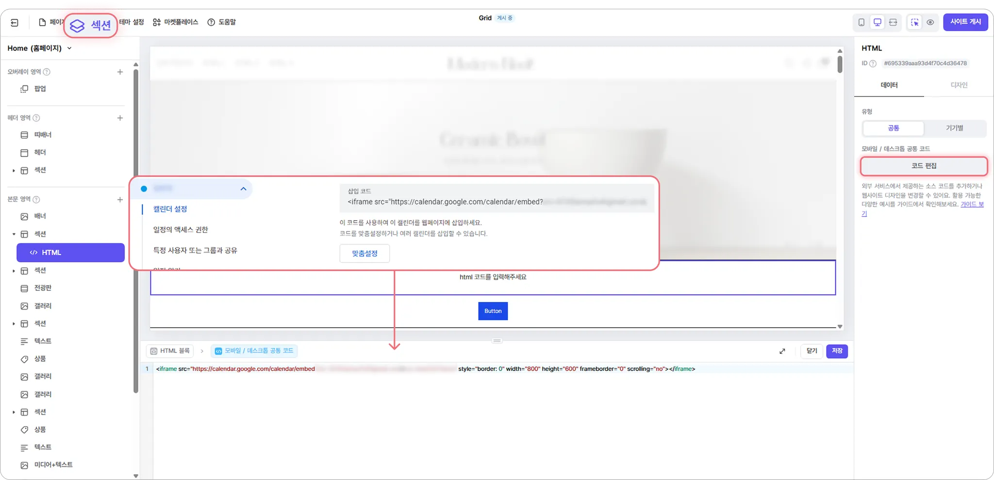 ② [섹션 추가 > 기본 요소]에서 html 블록을 선택해 주세요.