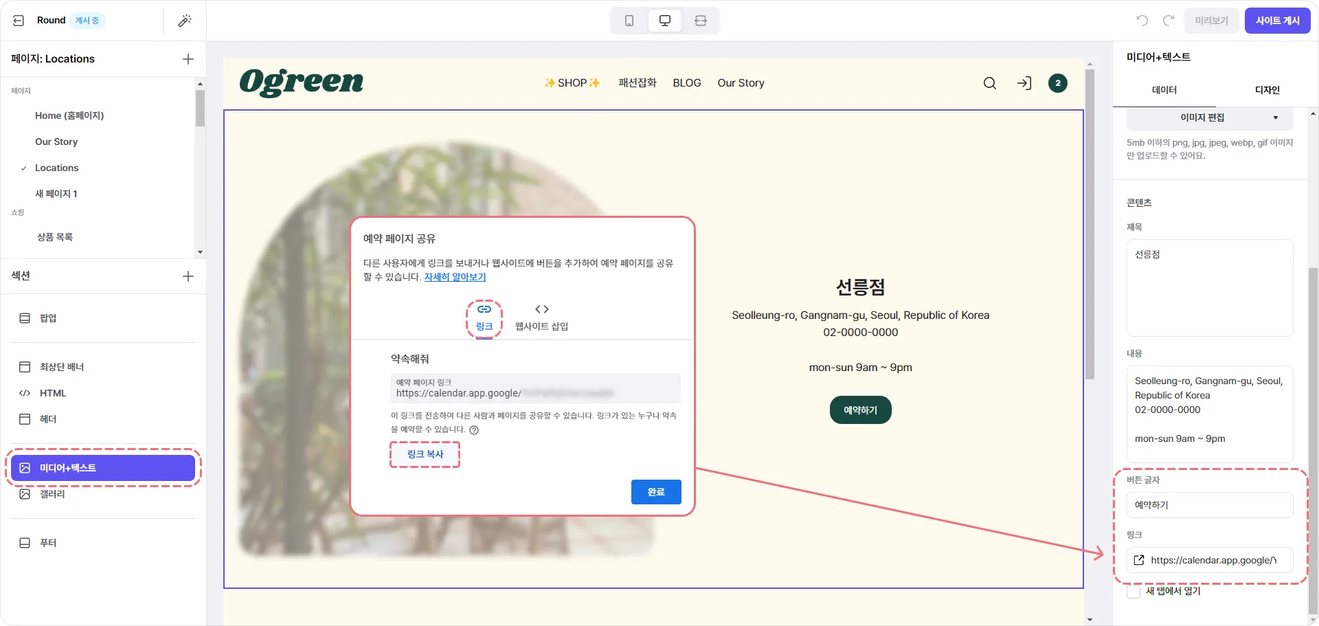 텍스트 섹션, 미디어 + 텍스트 섹션 등을 활용하여 버튼에 링크를 설정할 수 있습니다.