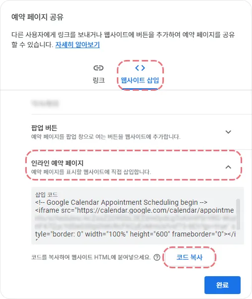 ③ 예약 페이지 공유 창에서 웹사이트 삽입을 선택하고 인라인 예약 페이지를 클릭하여 코드를 복사해 주세요.