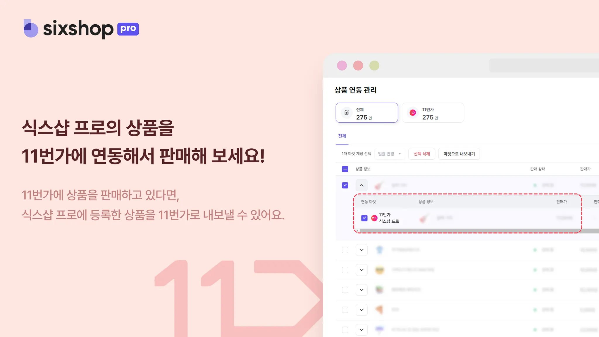 식스샵 프로에서 등록한 상품을 11번가에 내보낼 수 있어요.