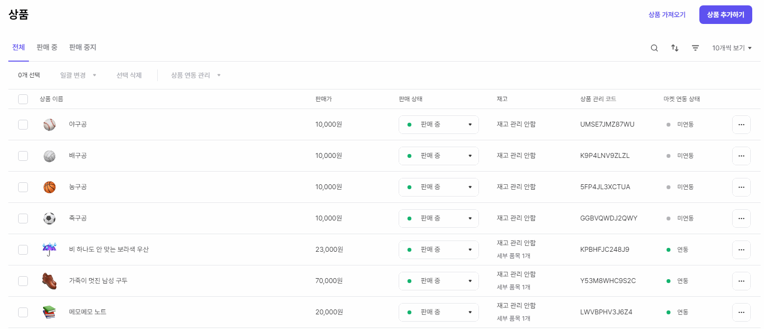 상품 이름 항목의 왼쪽 박스에 체크하면 페이지에 보이는 상품을 모두 선택할 수 있어요.