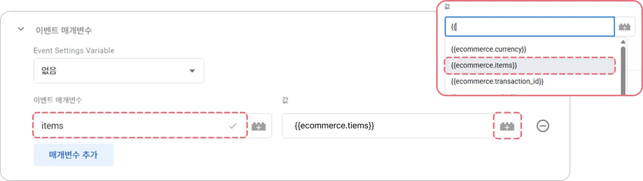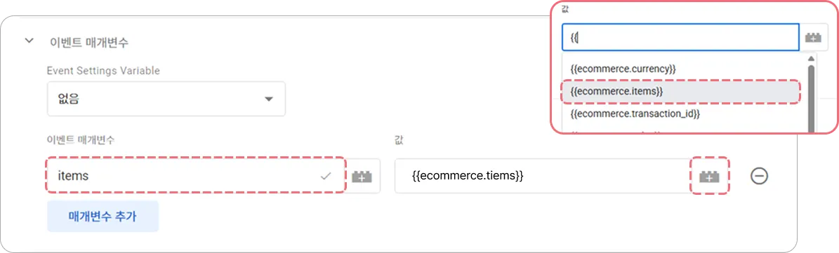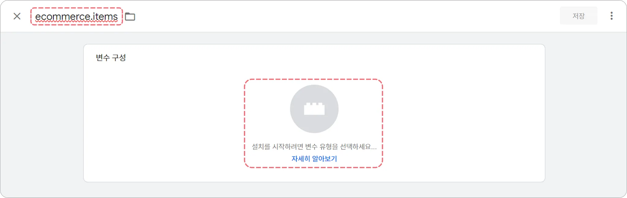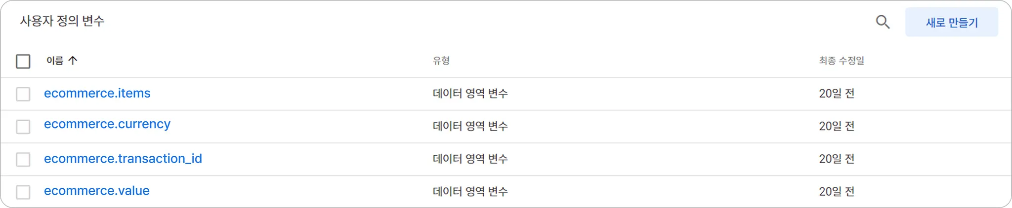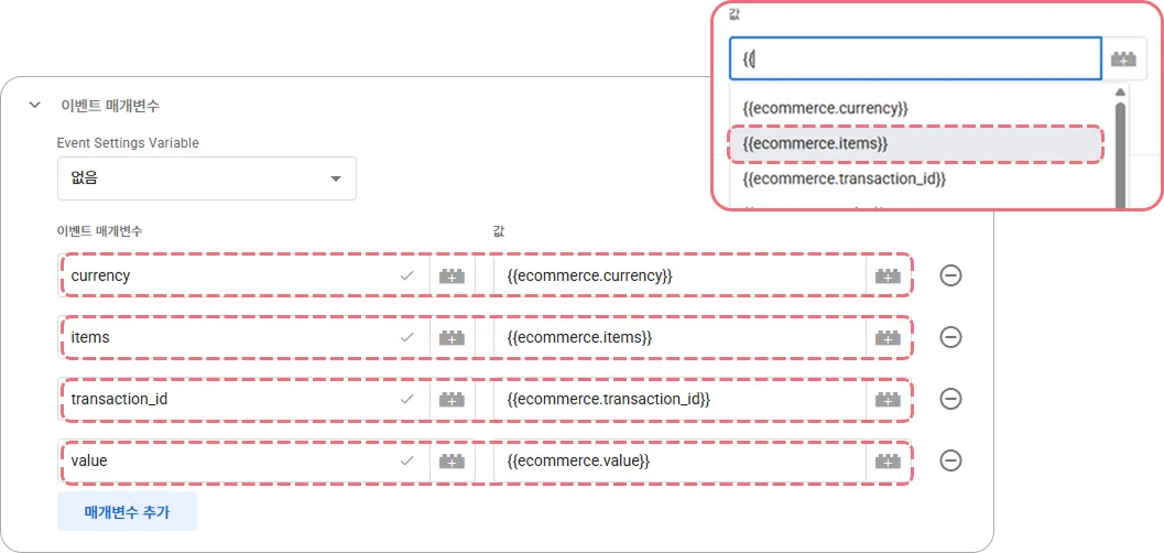 아래의 ecommerce.items 변수 등록 예시와 동일한 방식으로, 변수명만 변경하여 나머지 변수들도 순서대로 생성해 주세요.