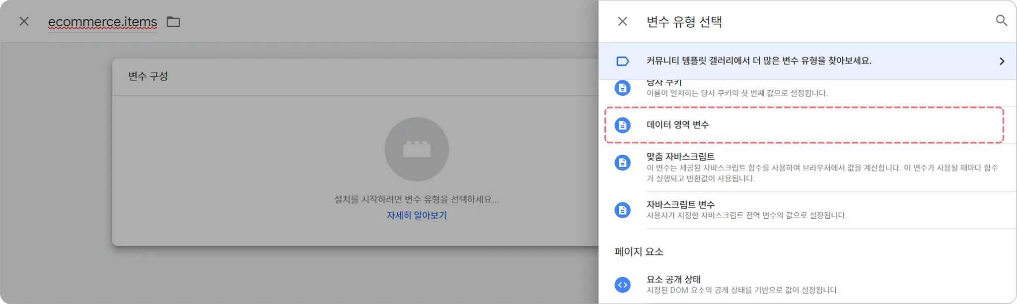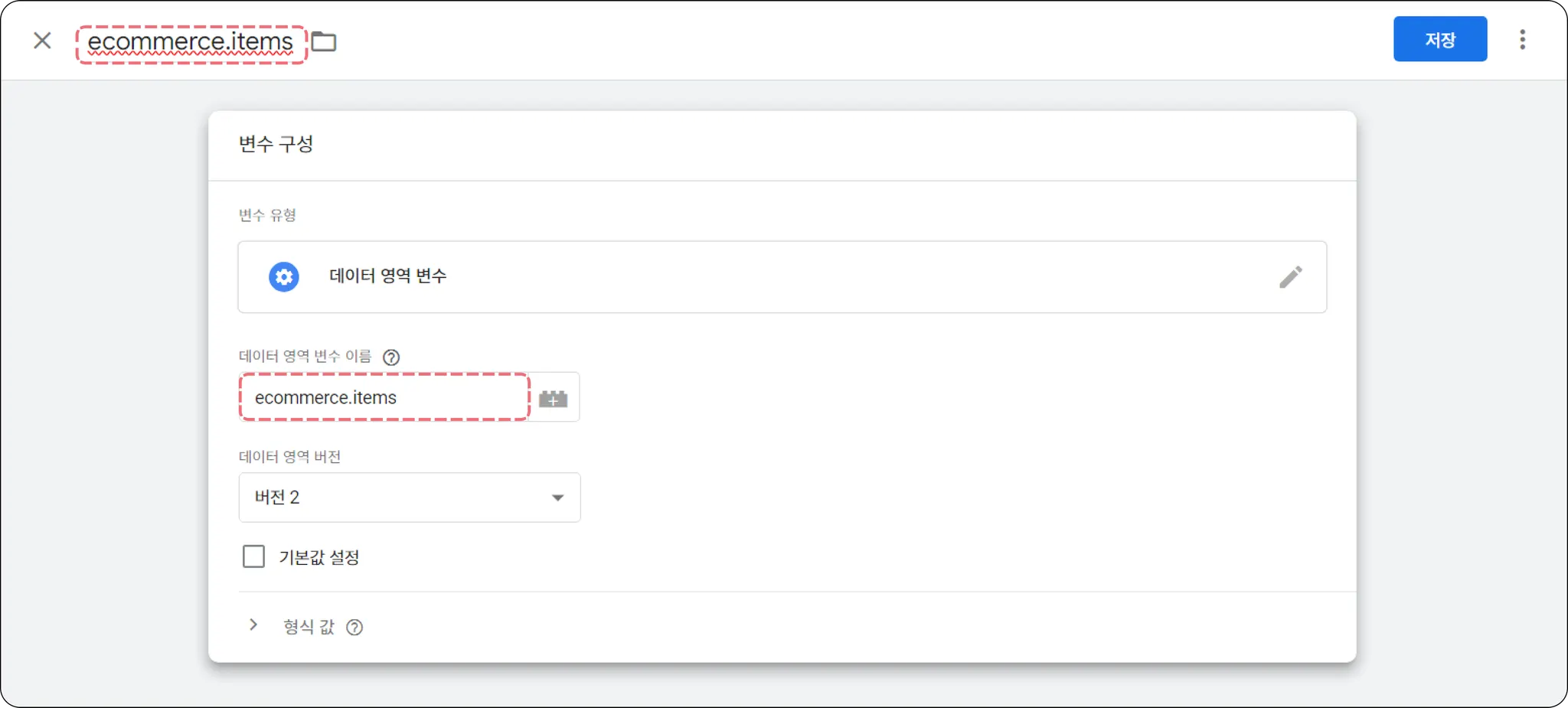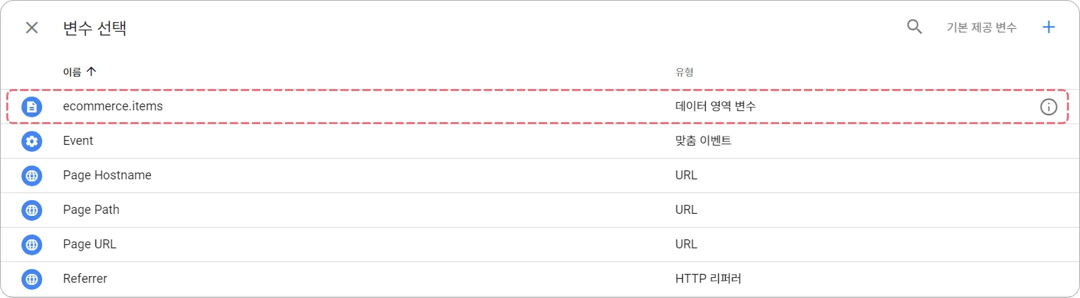 아래의 ecommerce.items 변수 등록 예시와 동일한 방식으로, 변수명만 변경하여 나머지 변수들도 순서대로 생성해 주세요.