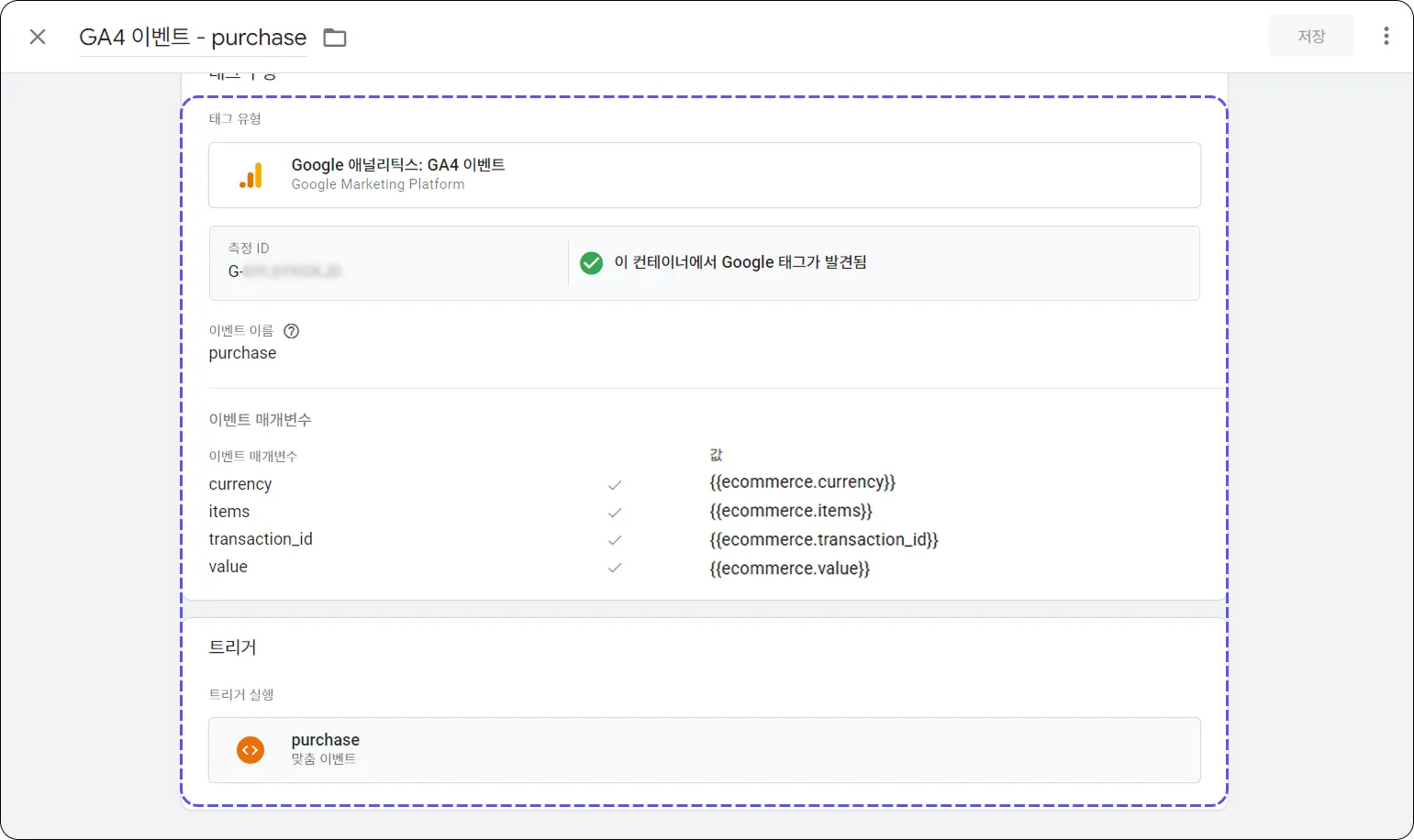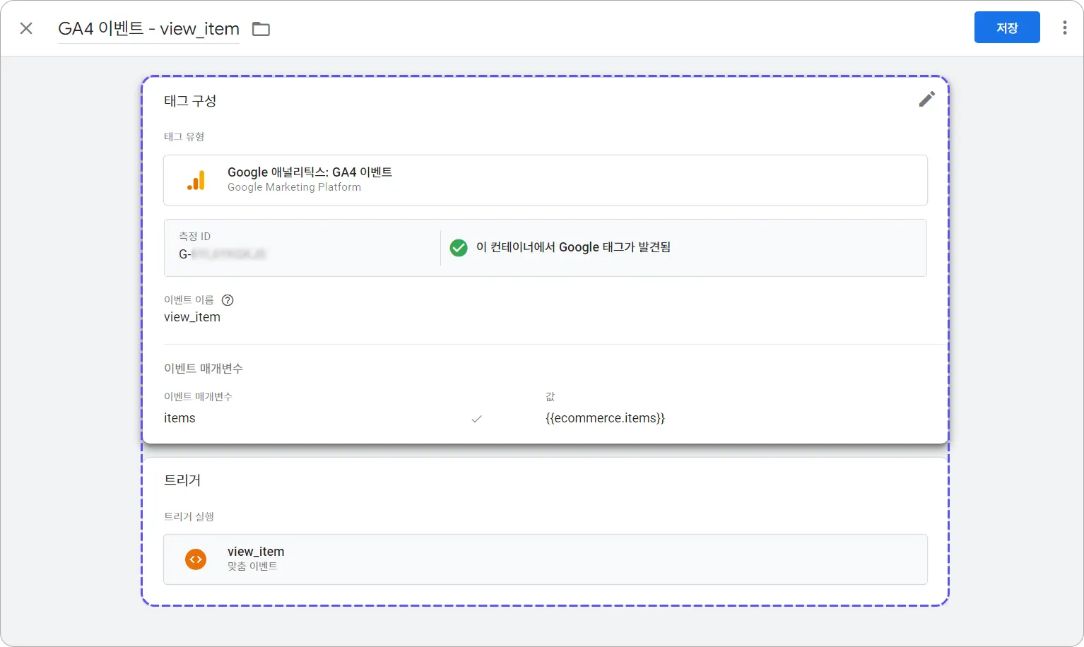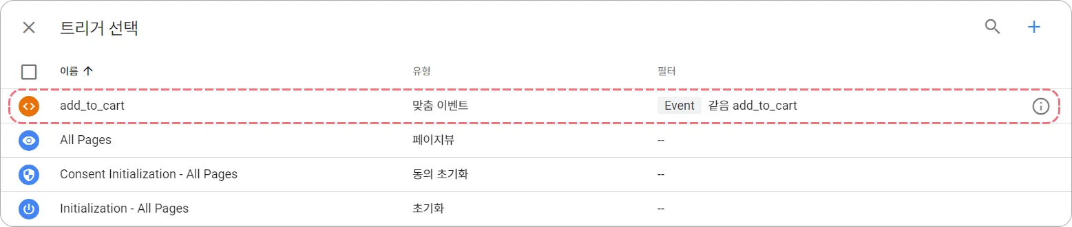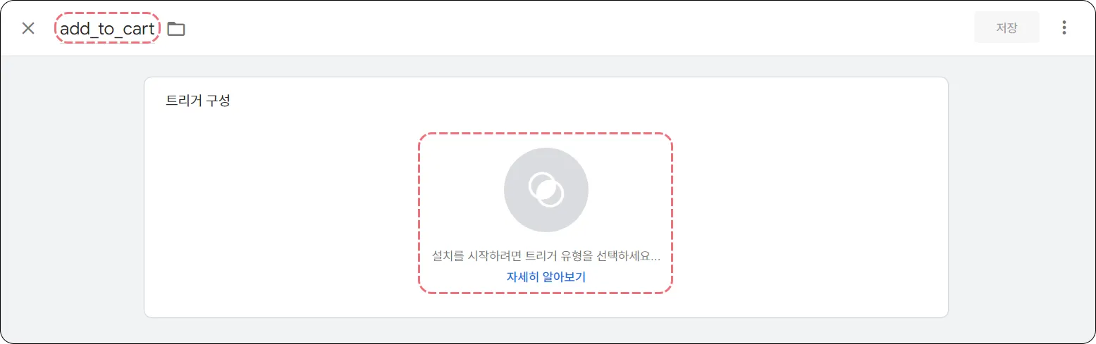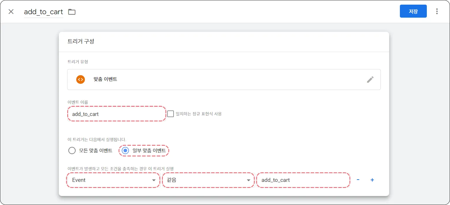 조건 - ‘Event / 같음 / add_to_cart(트리거 명)’을 입력한 뒤 저장