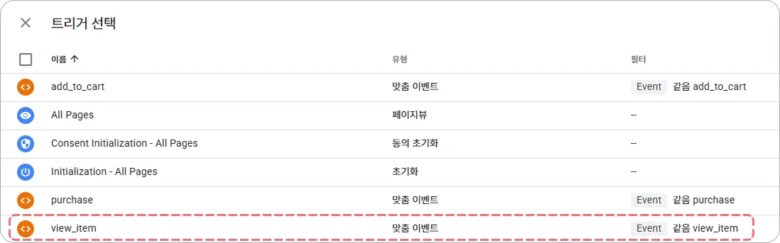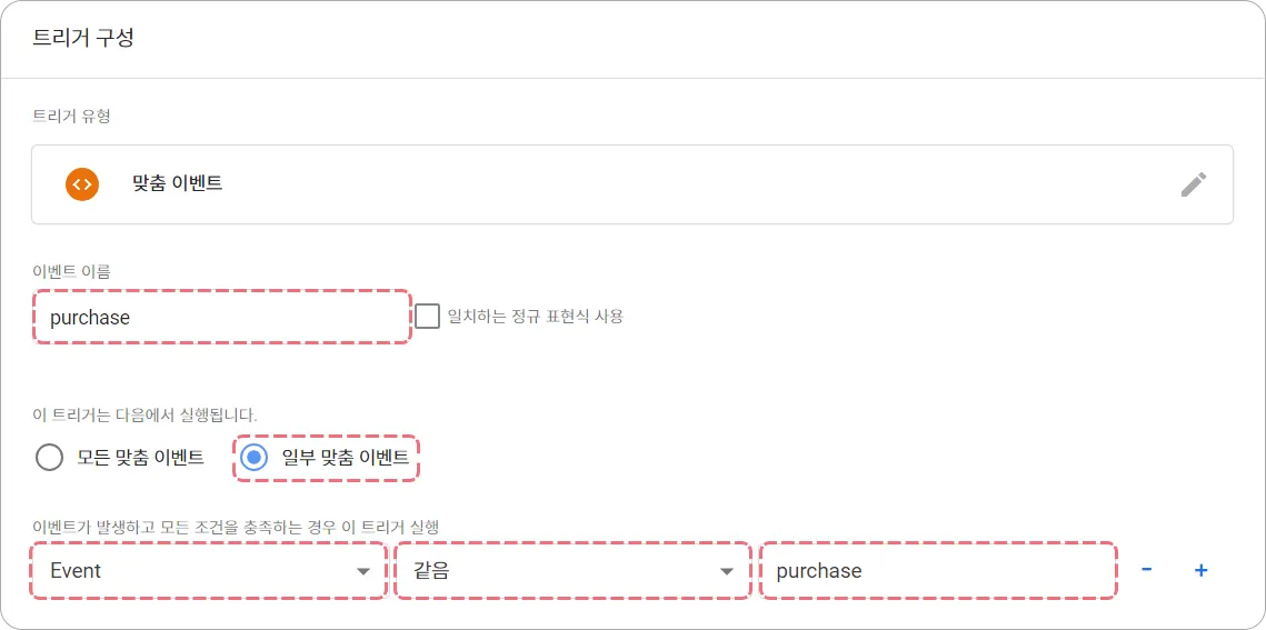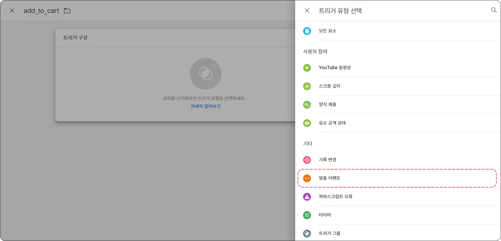 트리거 실행 방법 - ‘일부 맞춤 이벤트’ 선택