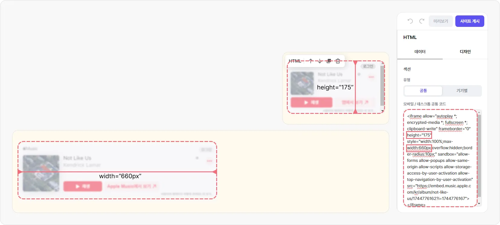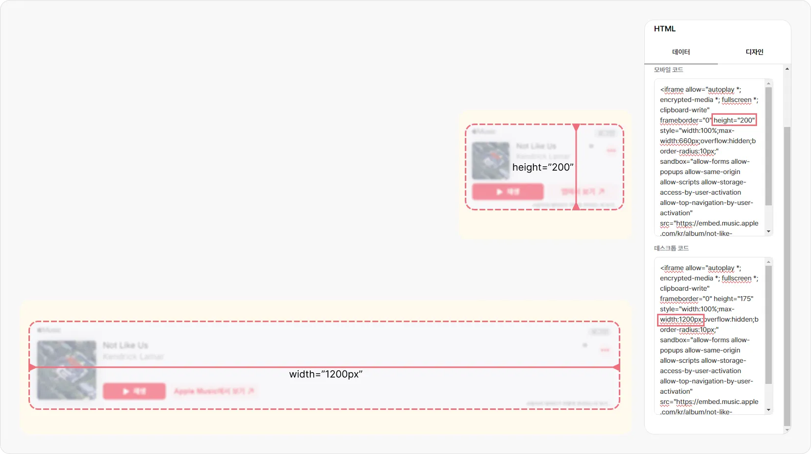 애플뮤직에서 제공한 코드대로 삽입됩니다. height나 width를 조절하여 크기를 변경해 볼 수 있습니다.
