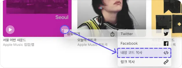 공유할 음악에서 ••• 을 클릭하고 공유하기 메뉴에서 내장 코드 복사를 눌러주세요.