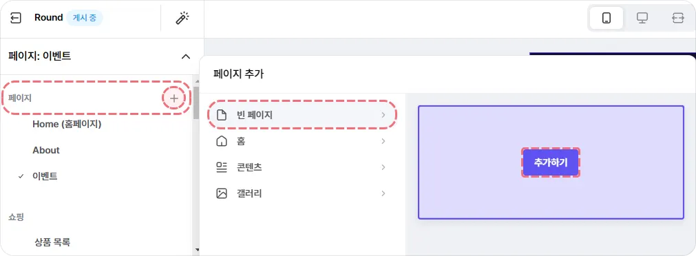 왼쪽 패널의 페이지 옆 + 를 클릭하고, 빈 페이지를 추가해 주세요.