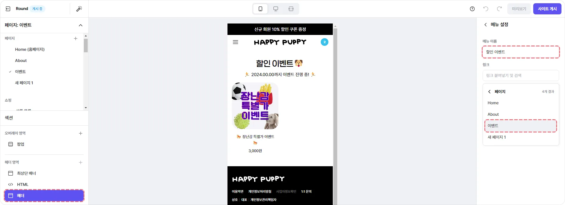 왼쪽 패널의 헤더 영역에서 헤더 섹션을 클릭하고, 오른쪽 패널에서 메뉴 탭을 클릭해 주세요.