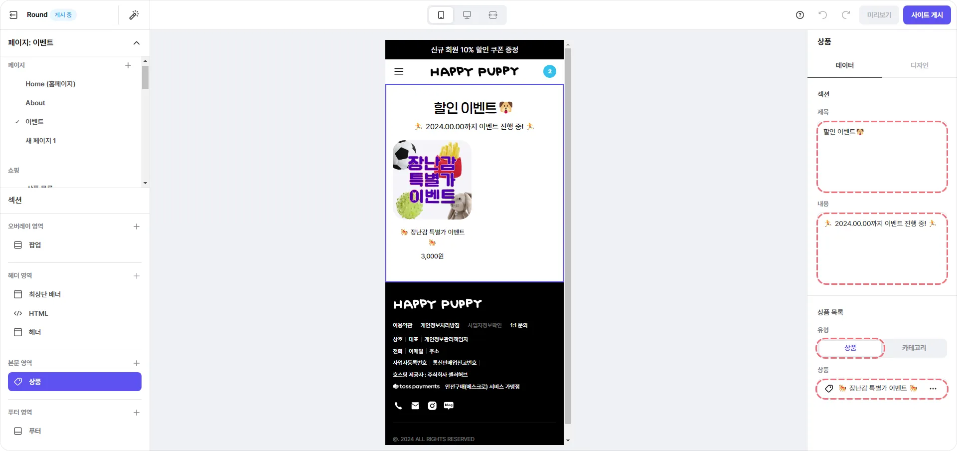 오른쪽 상단 사이트 게시를 클릭하면 웹사이트에 페이지가 노출됩니다.