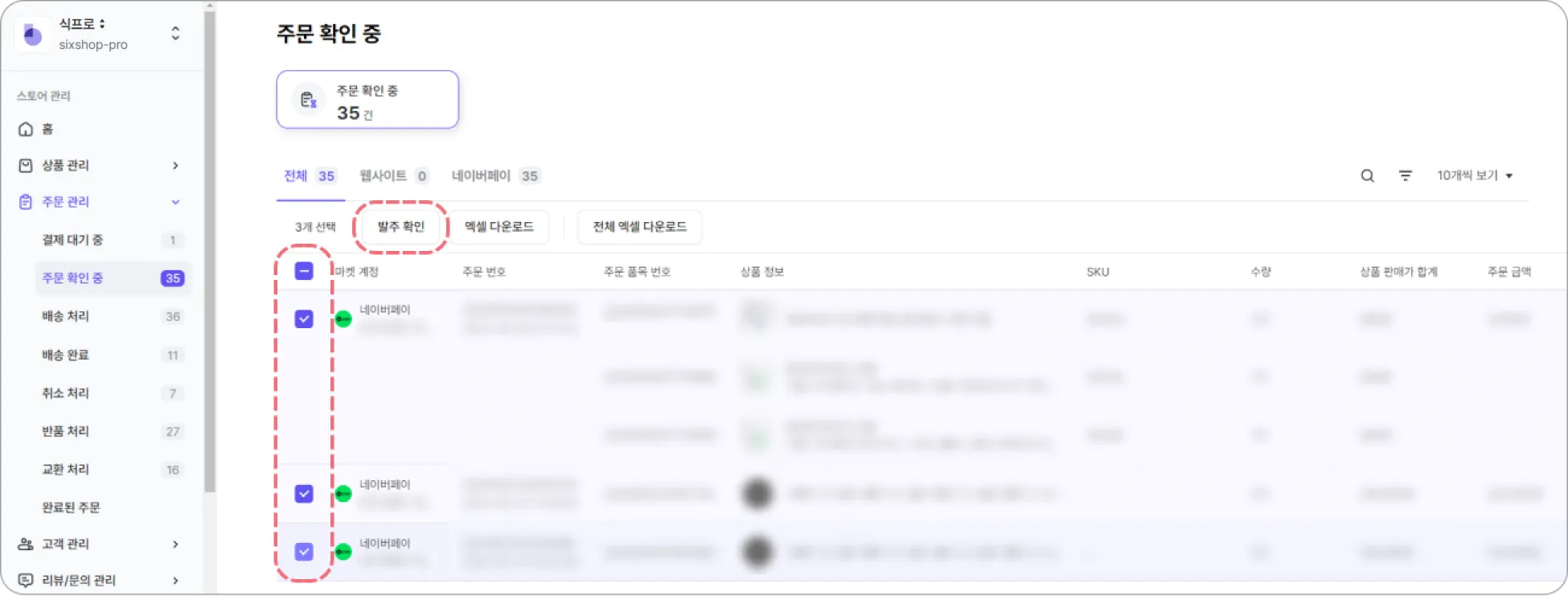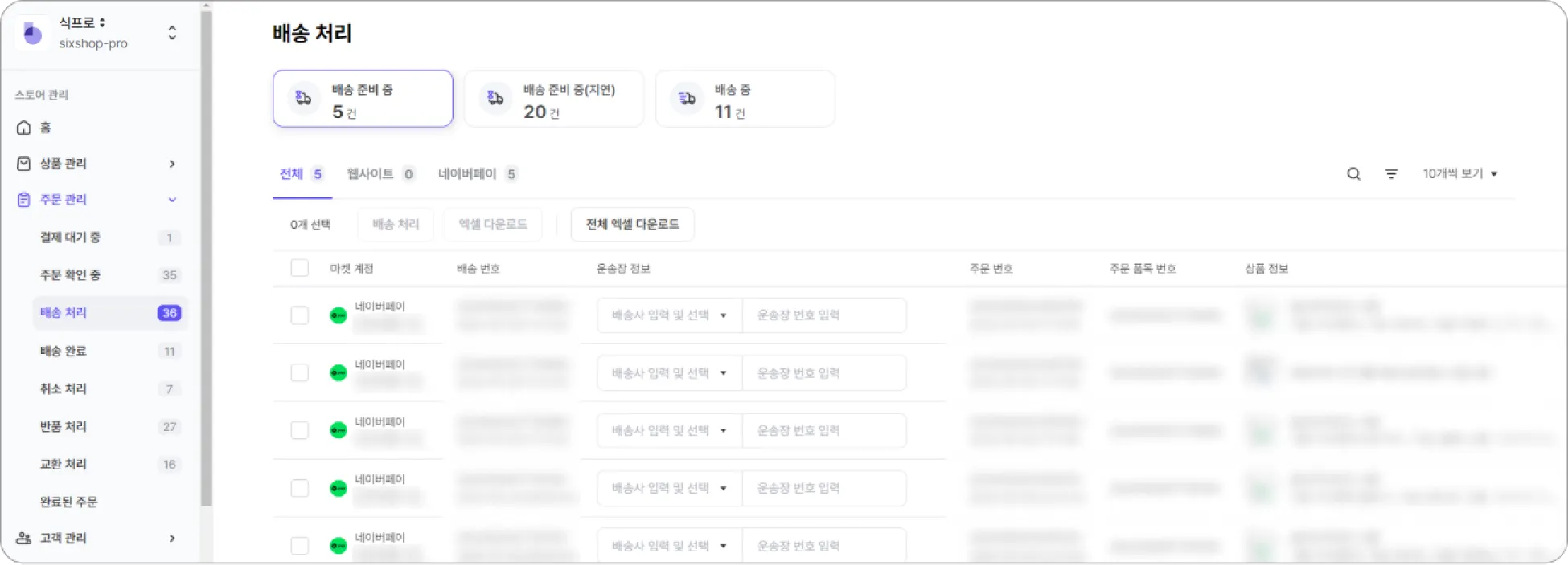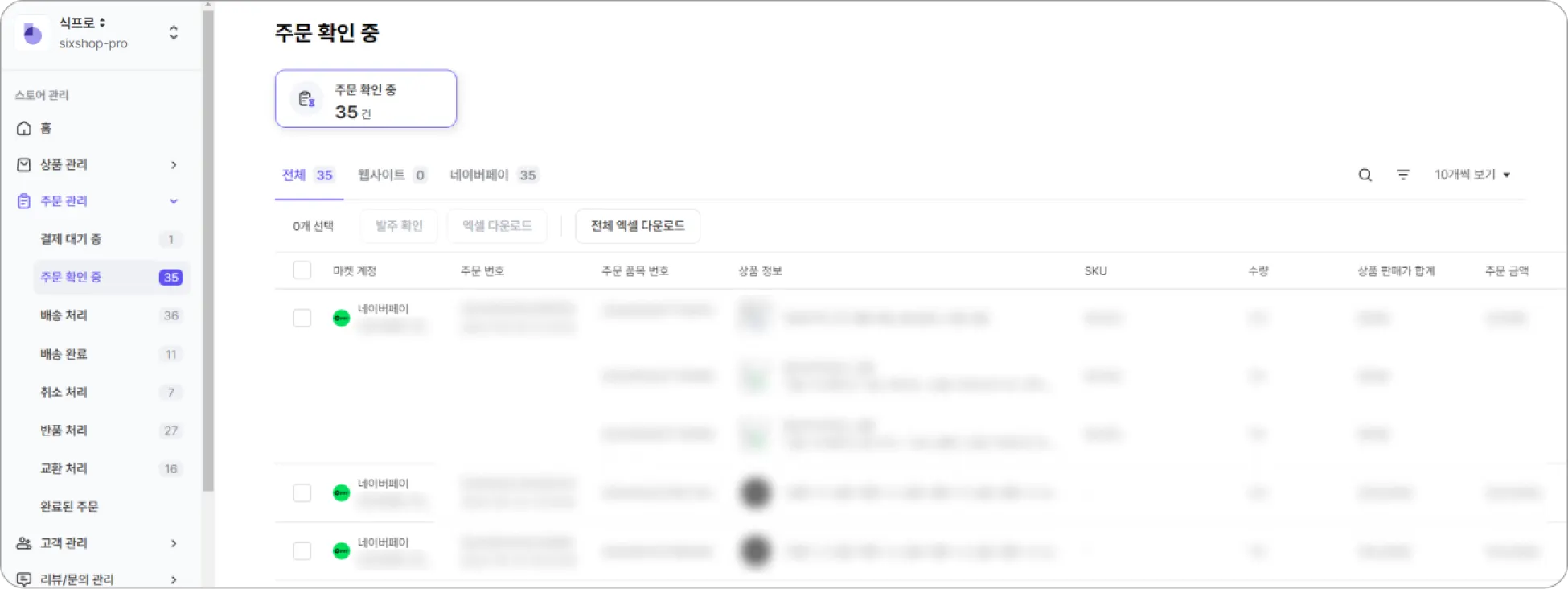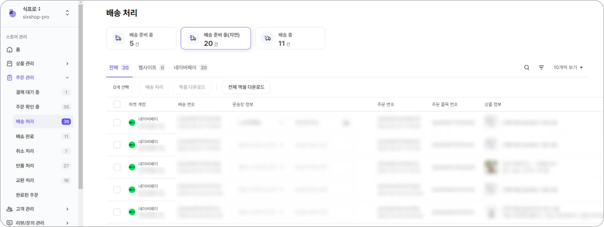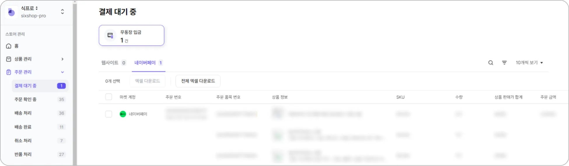 네이버페이(주문형) 주문 발생 시, 운영자는 [식스샵 프로 > 주문 관리]에서 주문 상태를 관리할 수 있습니다.