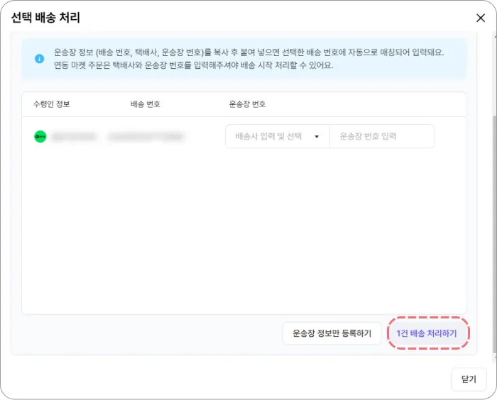 배송 처리 이후에는 운송장 정보를 변경할 수 없으니 유의해 주세요!