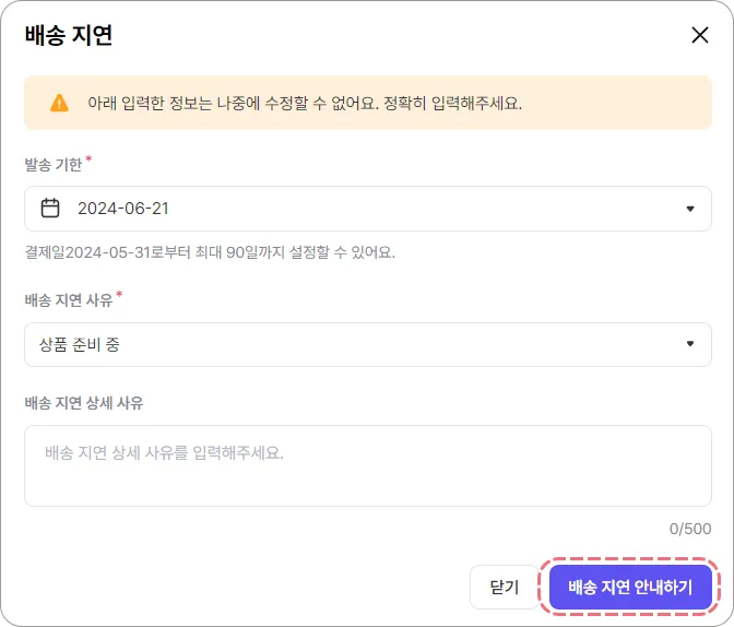 발송 예정일과 지연 사유를 입력한 후 배송 지연 안내하기 클릭