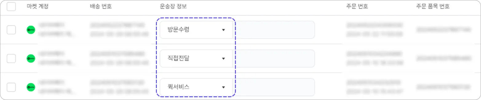 → 배송 정보가 없다면, 기본 유형인 택배 배송으로 설정됩니다. 기타 배송 유형이라면 주문 목록 페이지에 별도로 등록해 주세요.