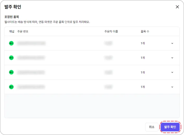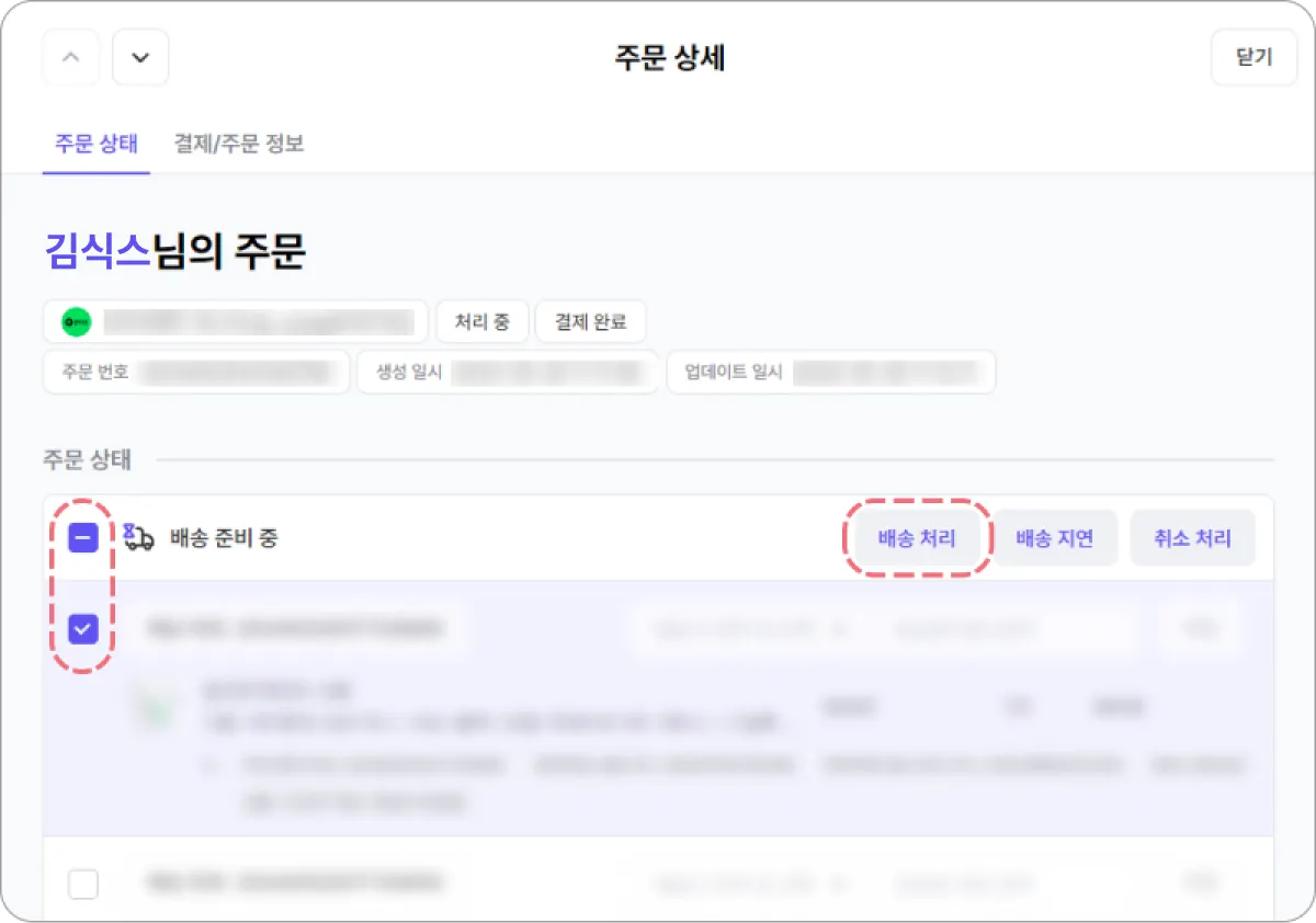선택한 주문 품목을 확인 후 배송 처리하기 클릭