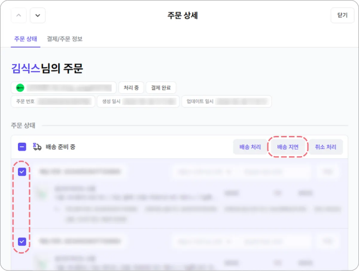 배송 지연 처리는, 주문 상세 페이지에서 개별 처리해 주셔야 합니다.