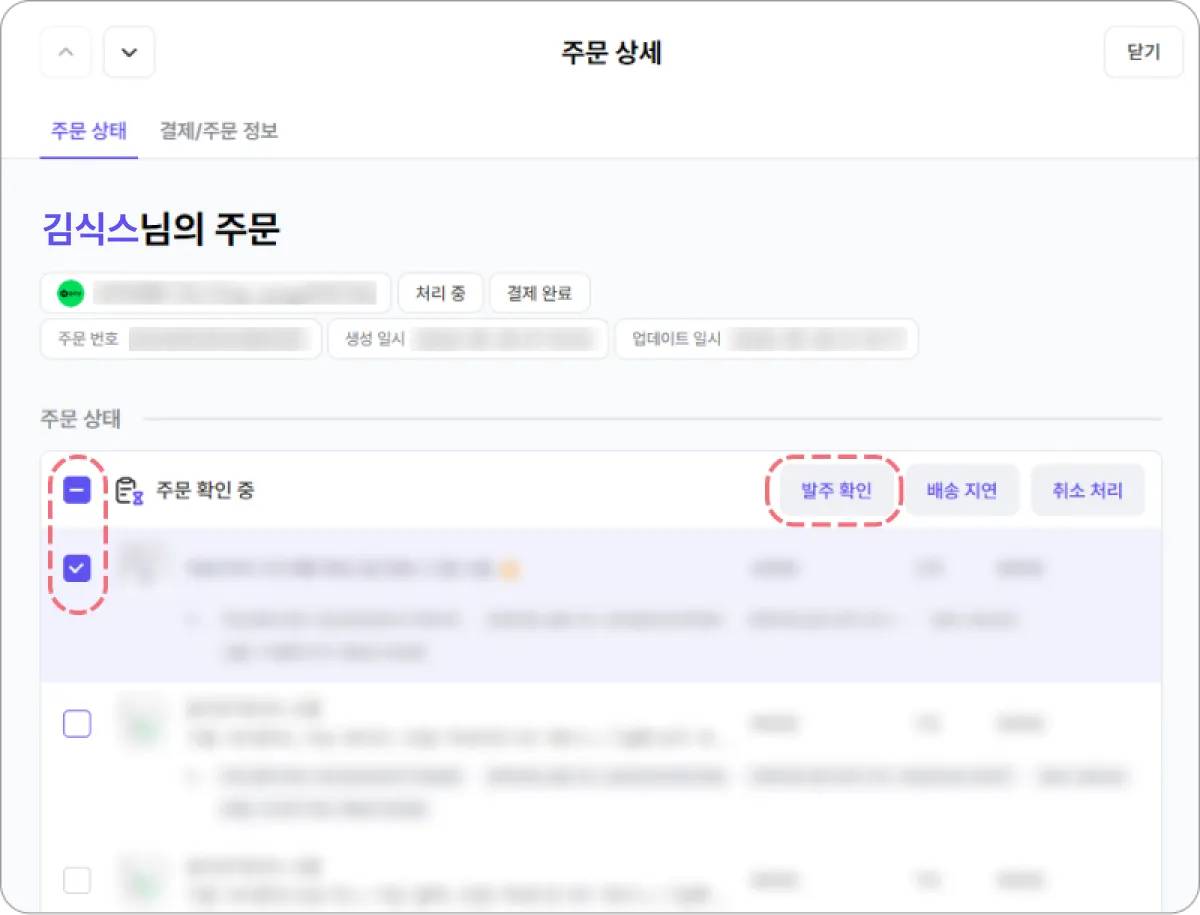 주문 목록에서 발주 확인할 주문을 클릭하여 주문 상세 페이지로 이동