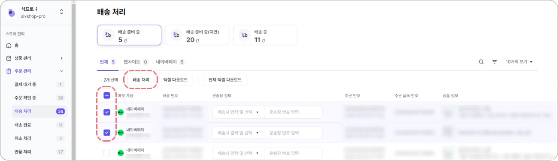 주문 목록에서 배송 처리할 주문을 체크한 후, 상단의 배송 처리 클릭