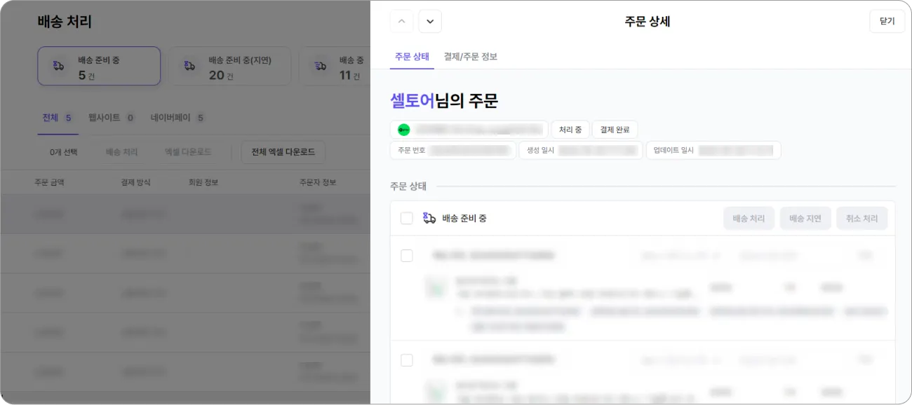 배송 준비 중이거나 배송 중인 주문은 [주문 관리 > 배송 처리]에서 확인할 수 있습니다.