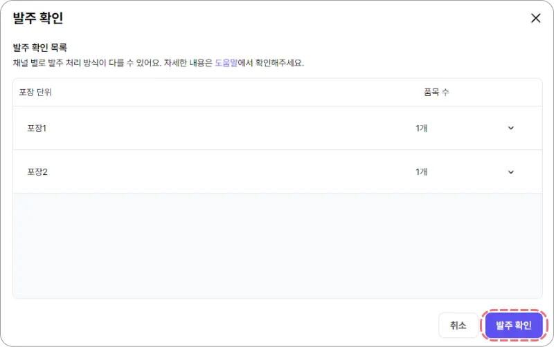 선택한 배송 품목을 확인 후 배송 처리하기 클릭