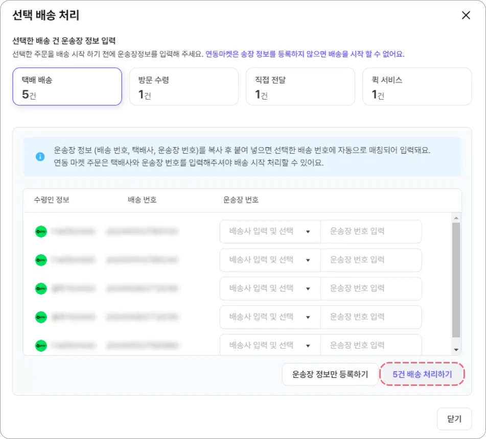 배송 유형(택배 배송, 방문 수령, 직접 전달, 퀵 서비스)별로 배송 처리 할 수 있습니다.