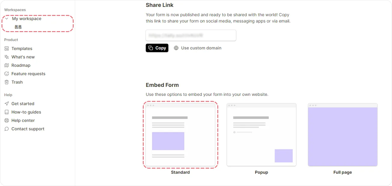 Workspaces에서 코드를 복사할 폼을 선택한 후, Standard를 선택해 주세요.